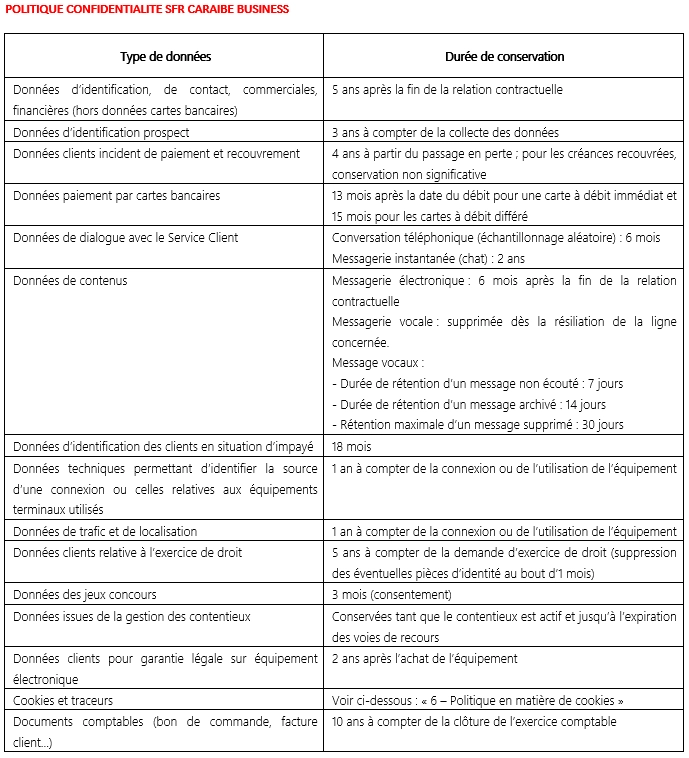 – Quand SFR Caraïbe n’a plus besoin des données à caractère personnel aux fins du traitement mais que celles-ci vous sont encore nécessaires pour la constatation, l’exercice ou la défense de droits en justice ;